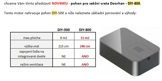 Vážení obchodní partneři, chtěli bychom Vám představit nový stropní pohon pro sekční garážová vrata DIY - 800 Sada obsahuje pohon, kolejnici s